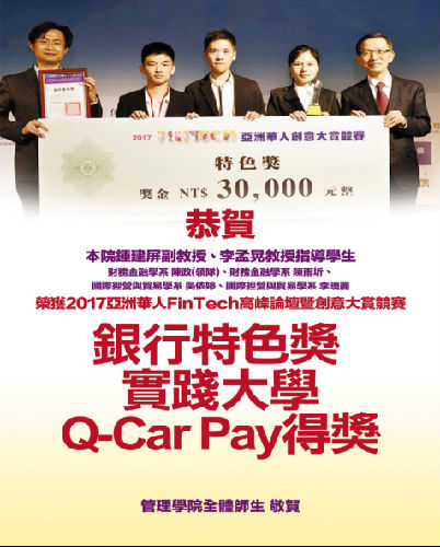 4月26日,由台北工商时报、台湾金融服务业联合总会联合主办的“2017亚洲华人FinTech高峰论坛暨创意大赏竞赛”在台北集思台大国际会议厅落下帷幕,耽美小说 2014级赴台湾实践大学学习的学生陈政、陈雨圻、吴依婷、李晓丽4位同学组成的“Q—Car Pay”队代表实践大学参赛,一举摘得银行类特色奖。