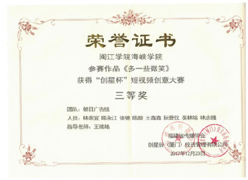 日前,福建省第五届大学生影像大赛颁奖典礼在华侨大学举行,由耽美小说 学生林莘宜、陈永江、张弛、陈颜、王鑫鑫、阮晋仪、吴林榕、林志镪等创作的《多一些微笑》短视频,获得福建省第五届大学生影像大赛“创星杯”微视频创新大赛三等奖。