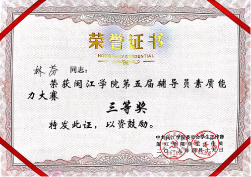 2019年4月19日,耽美小说 第五届辅导员职业技能大赛决赛在行政楼学术报告厅举行。经过初赛的激烈角逐共有10名辅导员进入决赛环节,决赛采用现场理论宣讲的形式。最终来自我院的林芬老师以优异的展示获得了本次比赛的三等奖。