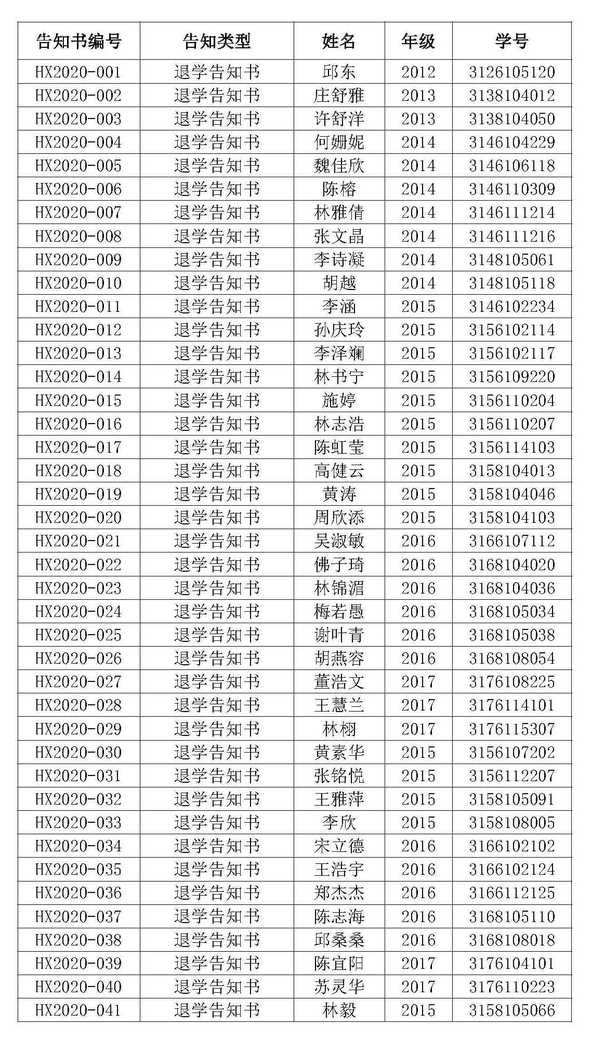 根据《耽美小说 普通本科学生学籍管理实施细则》第十章第四十八条“学生有下列情形之一,可作退学处理:(三)休学期满,未提出复学申请或申请复学复查不合格的;”的规定,以及《普通高等学校学生管理规定》(教育部令第41号)的相关要求,经核查,耽美小说 邱东等41名学生休学期满未到校办理复学或注册学籍手续,现依据学校退学处理流程,对邱东等41名学生发出《退学告知书》,并予以公示,名单如下: