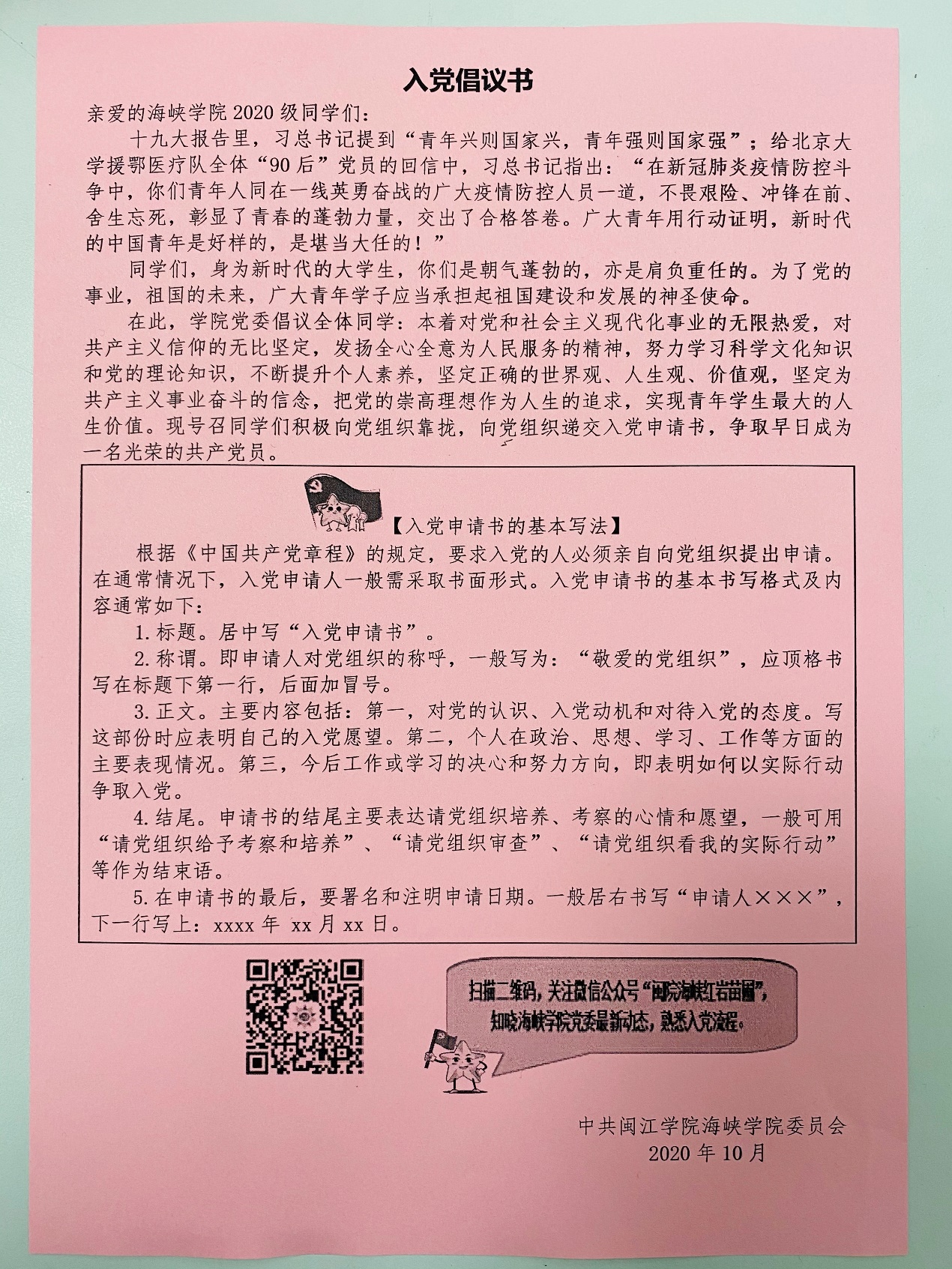 此次入党教育讲座,既是新生入党教育的第一课,也是爱国主义教育的第一课,更是“红岩苗圃”滴灌式教育之共青团员“红心培育计划”的重要内容之一。讲座不仅弘扬了伟大的抗疫精神,增强了全体新生的爱国情怀和民族自豪感,还加深了新生对党的认识,极大地激发了入党积极性,端正了入党动机。讲座结束后,学院党委为全体新生发放了《入党倡议书》。