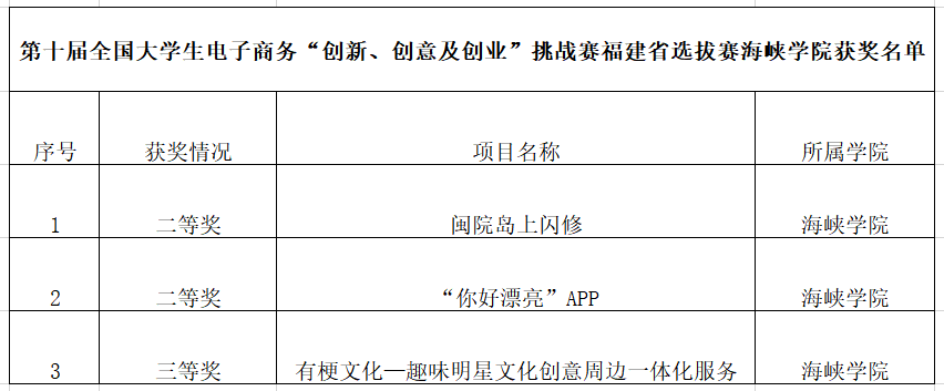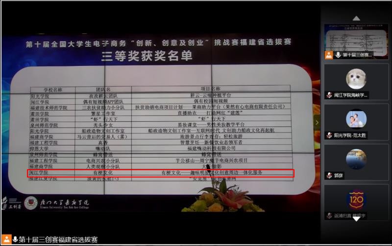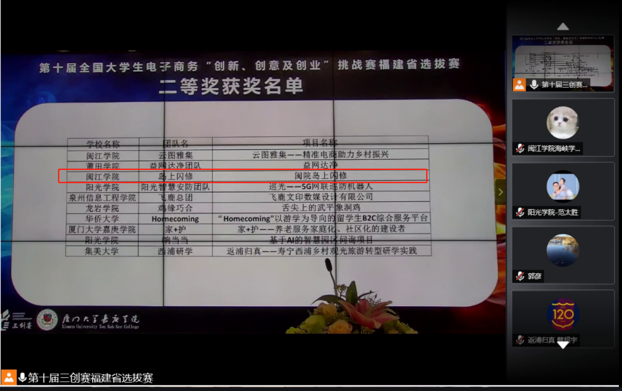 比赛结束后,主办方进行了闭幕式暨颁奖典礼。最终,我院《闽院岛上闪修》、《你好漂亮APP》两个项目团队荣获二等奖;《有梗文化—趣味明星文化创意周边一体化服务》项目团队荣获三等奖。