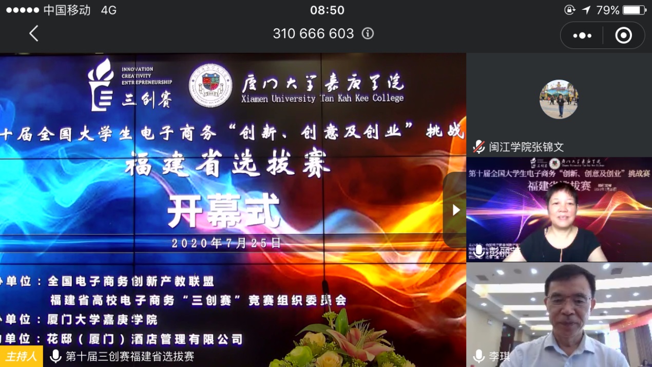 2020年7月25日,第十届全国大学生电子商务“创新、创意及创业”挑战赛(以下简称“三创赛”)福建赛区省级选拔赛在厦门大学嘉庚学院隆重举行,本次比赛由全国电子商务创新产教联盟、福建省高校电子商务“三创赛”竞赛组织委员会主办,厦门大学嘉庚学院承办。