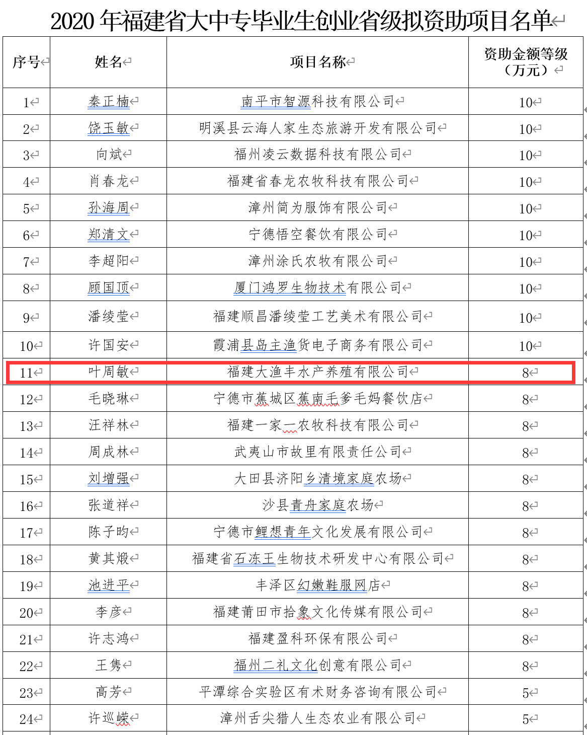 近日,福建省人力资源和社会保障厅公示了“2020年大中专毕业生创业省级拟资助项目名单”,此次公布的名单项目是根据省委、省政府下发的评审文件要求,并经过网上申报、资格审核、书面评审、实地考察、现场答辩和会议研究等程序的层层考察,确定的110个2020年拟资助省级项目,其中, 我院2019届工商管理专业校友叶周敏的“福建大渔丰水产养殖有限公司”项目获得8万元的资助金额,位列资助金额等级第二(并列)。