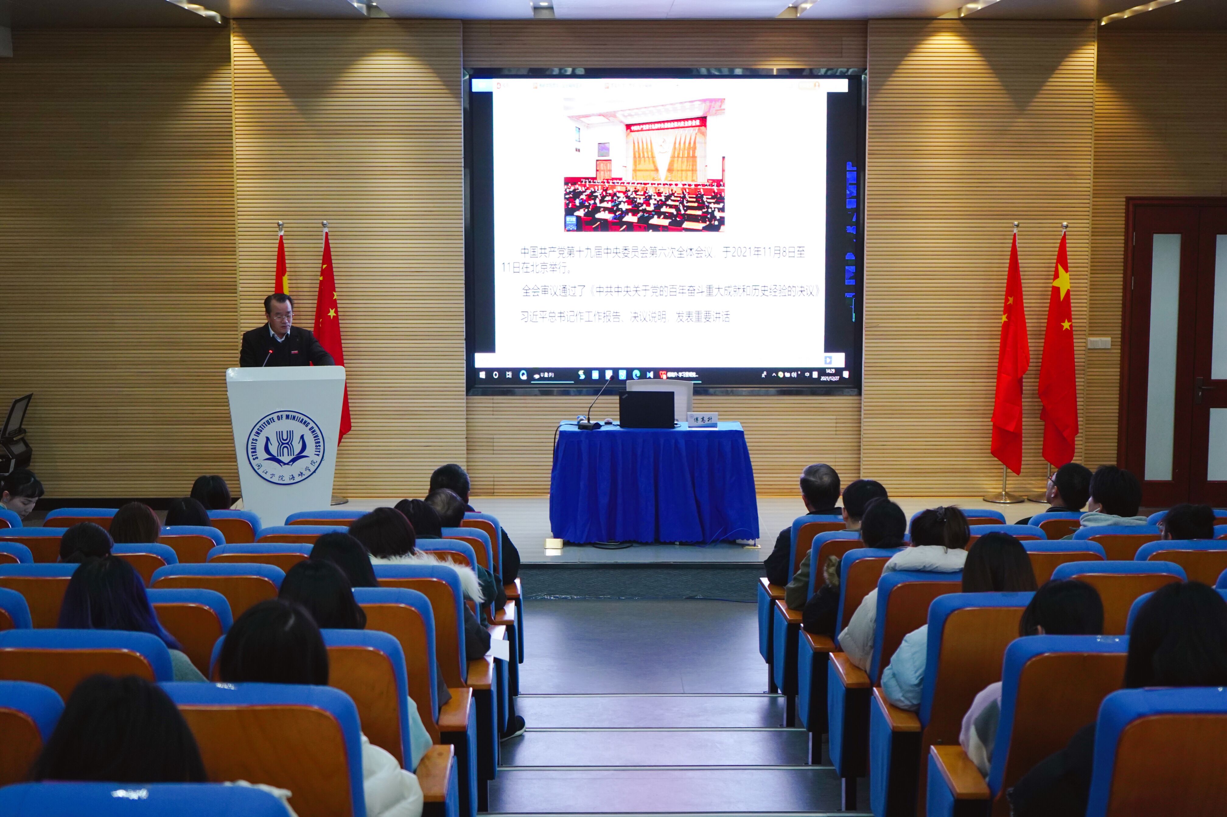 傅高升副校长从“党的十九届六中全会作出新的历史决议的重大意义”、“学懂弄通十九届六中全会《决议》的重点内容”、“‘踏上新的赶考之路’,第二个百年里我们要做什么”三个方面系统阐释了中国共产党百年奋斗的重大成就、历史意义和历史经验。他强调,党的十九届六中全会的一个重大贡献和突出亮点,是对习近平新时代中国特色社会主义思想的全新概括和科学阐述。我们要立足新发展阶段、贯彻新发展理念、服务和融入新发展格局,紧扣“四个更大”重要要求,发挥福建优势,聚焦重点领域和关键环节;做到“五个突出”,不断满足人民日益增长的美好生活需要,全方位推进高质量发展超越,全面加快新发展阶段新福建建设;实现“六新”目标任务,以优异成绩迎接党的二十大胜利召开。