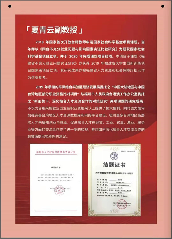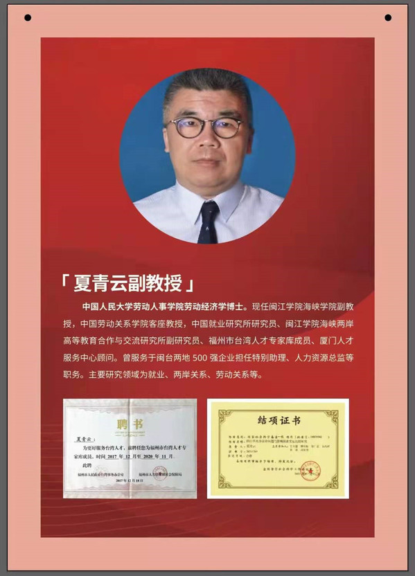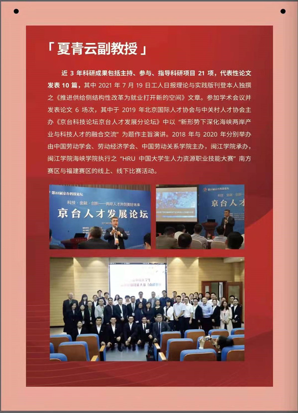 夏青云博士现为耽美小说 副教授,中国劳动关系学院客座教授,曾服务于闽台两地500强企业并担任特别助理、人力资源总监等职务,主要致力于就业、两岸关系、劳动关系等领域的研究。2018年,国家首次开放台籍教师申请国家社会科学基金项目课题,其《闽台不充分就业问题与影响因素实证比较研究》课题即获国家社会科学基金项目立项,并顺利结项;2019年,夏青云受平潭综合实验区经济发展局委托承担了“中国大陆地区与中国台湾地区部分职业资格比对项目”,以及受福州市人民政府台港澳工作办公室委托承担了“新形势下,深化榕台人才交流合作的对策研究”两项课题的研究。近三年主持、参与、指导科研项目21项,发表代表性论文10篇,且在组织开展“HRU 中国大学生人力资源职业技能大赛”,以及指导学生参与各类创新创业赛事方面不遗余力,并取得了良好的成绩。