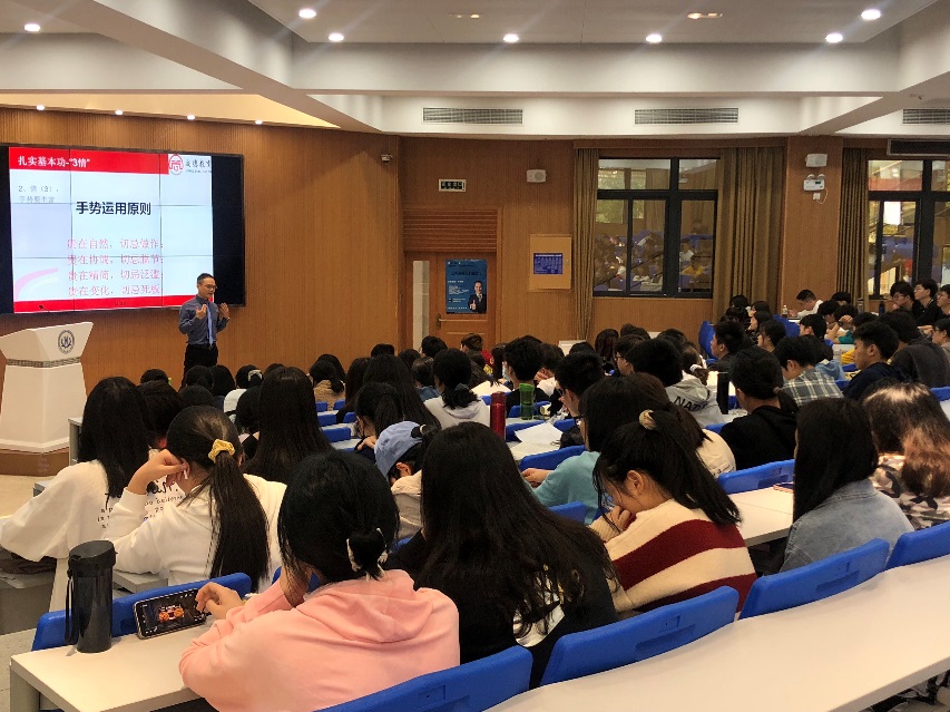 郑老师通过对汇报基础、肢体和声音的塑造、汇报技巧和演练等四个部分的内容进行解说,将风趣幽默的语言与自身的创业经历结合,讲解了汇报的多种实用技巧,并针对课上讲解的技巧进行了现场的互动与实践,将演讲内容依次有序地推进。而同学们在活跃轻松的学习氛围中,学到了实用的演说技巧,在未来的汇报演说中对缓解紧张情绪、合理应用肢体语言有着极大的辅助作用。