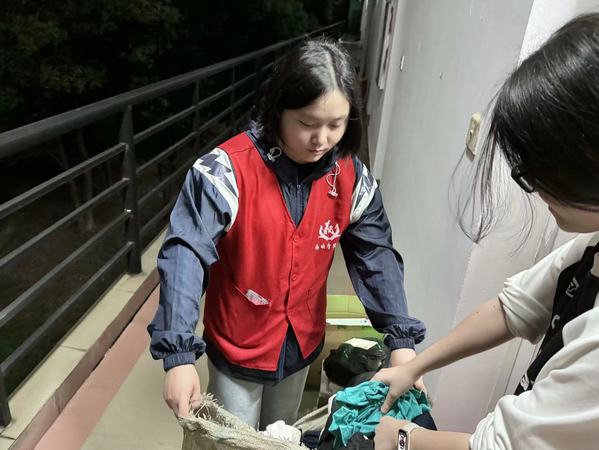 一道道忙碌的红色身影辛勤地穿梭在社区的每个角落。同学们也热情回应,使每一份微小的善意变成了触手可及的爱。一个个沉甸甸的袋子,装满了同学们的热情与爱心。活动结束后,为满足不同季节和人群的需求,志愿者们展开衣物的筛选,确保每一件衣物都能整洁有序地分类,让爱心真正落到了实处。