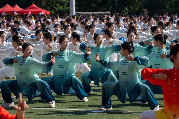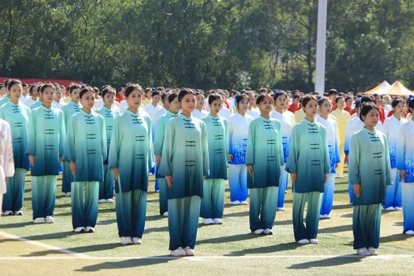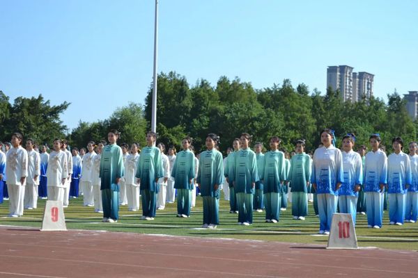 形随意动,内外合一。在千人健身操表演中,海峡学子们精神饱满,神采奕奕,他们身着以“只此青绿”为主色调的服装,踏着《水墨兰亭》节拍,随乐而动,放眼望去,似枝头随风摆动,又似碧波荡漾,如绿水青山般壮阔绚丽。
