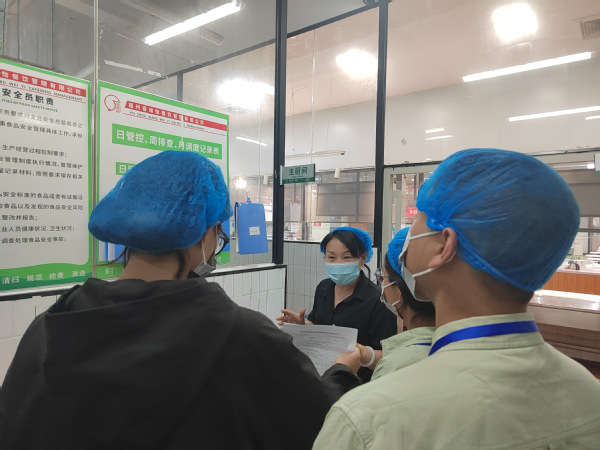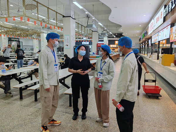 此外,检查人员针对食堂工作人员是否佩戴口罩、身穿工作服;仓库食品是否做到密封处理,贴好标签;食用油和大米是否与地面分离;地面是否有积水等等一系列卫生标准进行细致检查,同时指出部分工作间存在地面有积水、垃圾桶周围有食品残渣等问题。在填写表检查表时,检查人员进一步向楼层经理进行反馈,说明其存在的安全隐患,并提出了相应的改进建议。