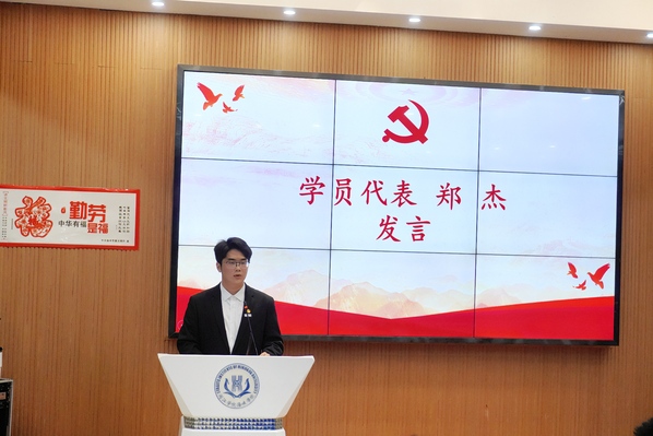 院党委组织员孙莉介绍了本期入党积极分子培训班的基本情况、培训内容、课程安排、培训要求以及结业考核方式等相关事宜。随后,学员代表2023级中美金融学专业郑杰同学发言。他表示,作为一名入党积极分子培训班学员,应深入学习党的基础知识,不断增强“四个意识”。他代表全体学员向党组织表态:将严守课堂纪律,认真学习并参与活动,将所学理论知识用于实践,提升政治觉悟和工作能力。