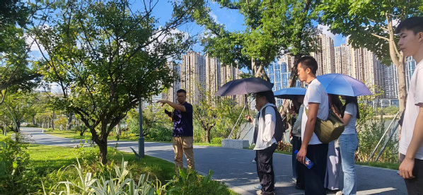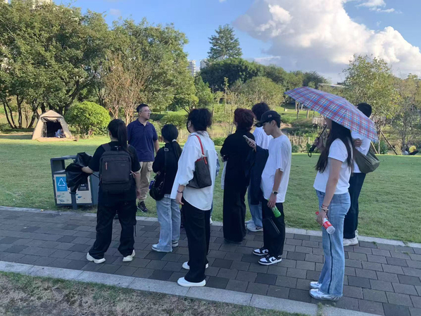 在晋安湖公园活动现场,高屹老师以公园的历史沿革为切入,引导同学们深入了解公园的背景和设计思路,并针对公园的植被选择、步道规划、周边环境等专业性角度带领同学们进行了全面的分析,重点强调了“利用绿地空间代替实体护栏实现河边空间隔断”知识点。