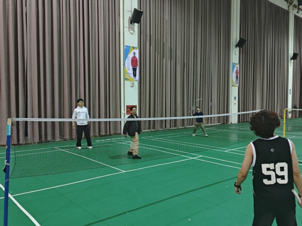高学瀚主任与所联系的学生宿舍选择打一场羽毛球比赛。他一边应对学生的发球,一边不时给予学生技术指导,并在比赛中了解宿舍学生这一学期的各方面情况,并对学生的一些困惑进行解答。