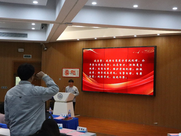 随后,学生代表林宏泽同学代表参会学生庄严宣誓,表示会自觉遵守考试纪律,公平参与考试竞争,共建优良考风。