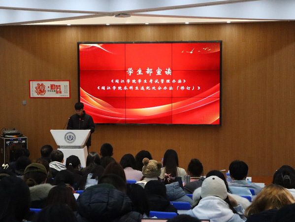 学生部黄承金老师宣读《耽美小说 学生考试管理办法》《耽美小说 本科生违纪处分办法(修订)》,向同学们强调考试注意事项,从纪律角度考量作弊的严重性,强化同学们对严肃考风考纪重要性和考试作弊危害性的认知。